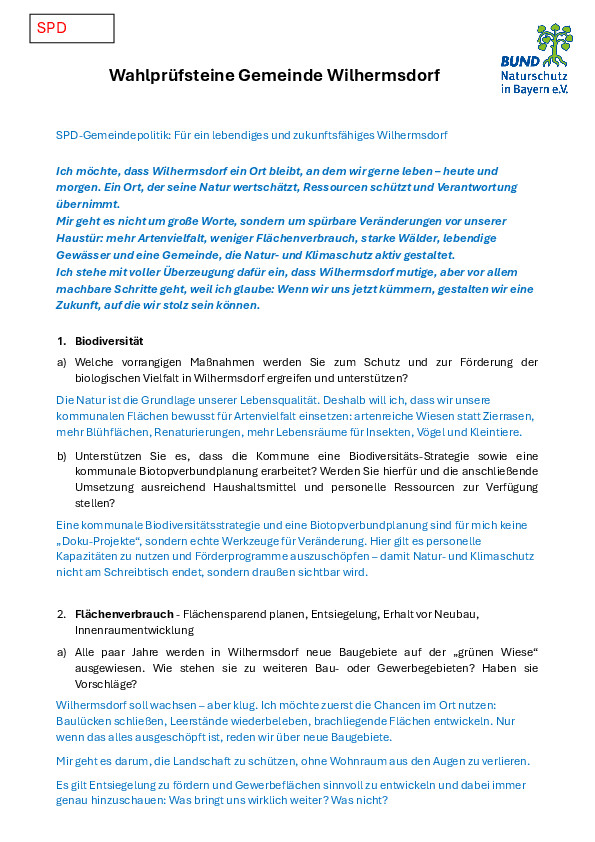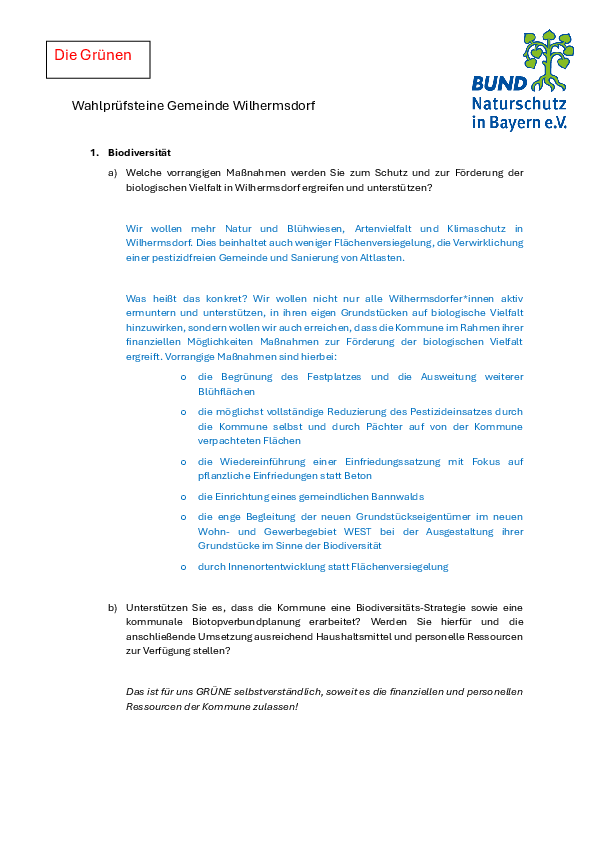 Der BUND Naturschutz in Wilhermsdorf hat Ende Januar 2026 an die Fraktionsvorsitzenden der demokratischen Parteien in Wilhermsdorf einen Fragebogen mit “Wahlprüfsteinen” verschickt und um Antwort bis 15.2.2026 gebeten.