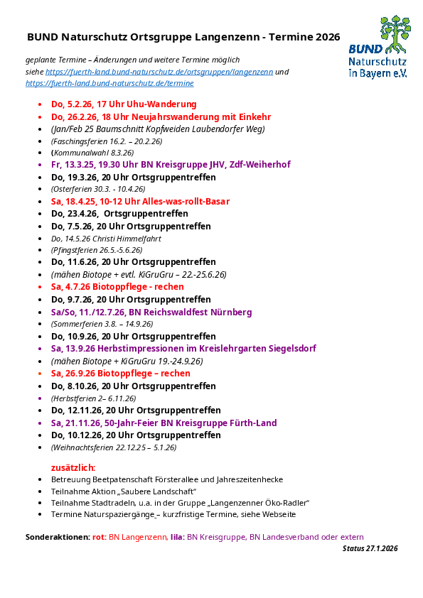 Termine der BN Ortsgruppe Langenzenn für 2026 finden Sie hier zum Download.