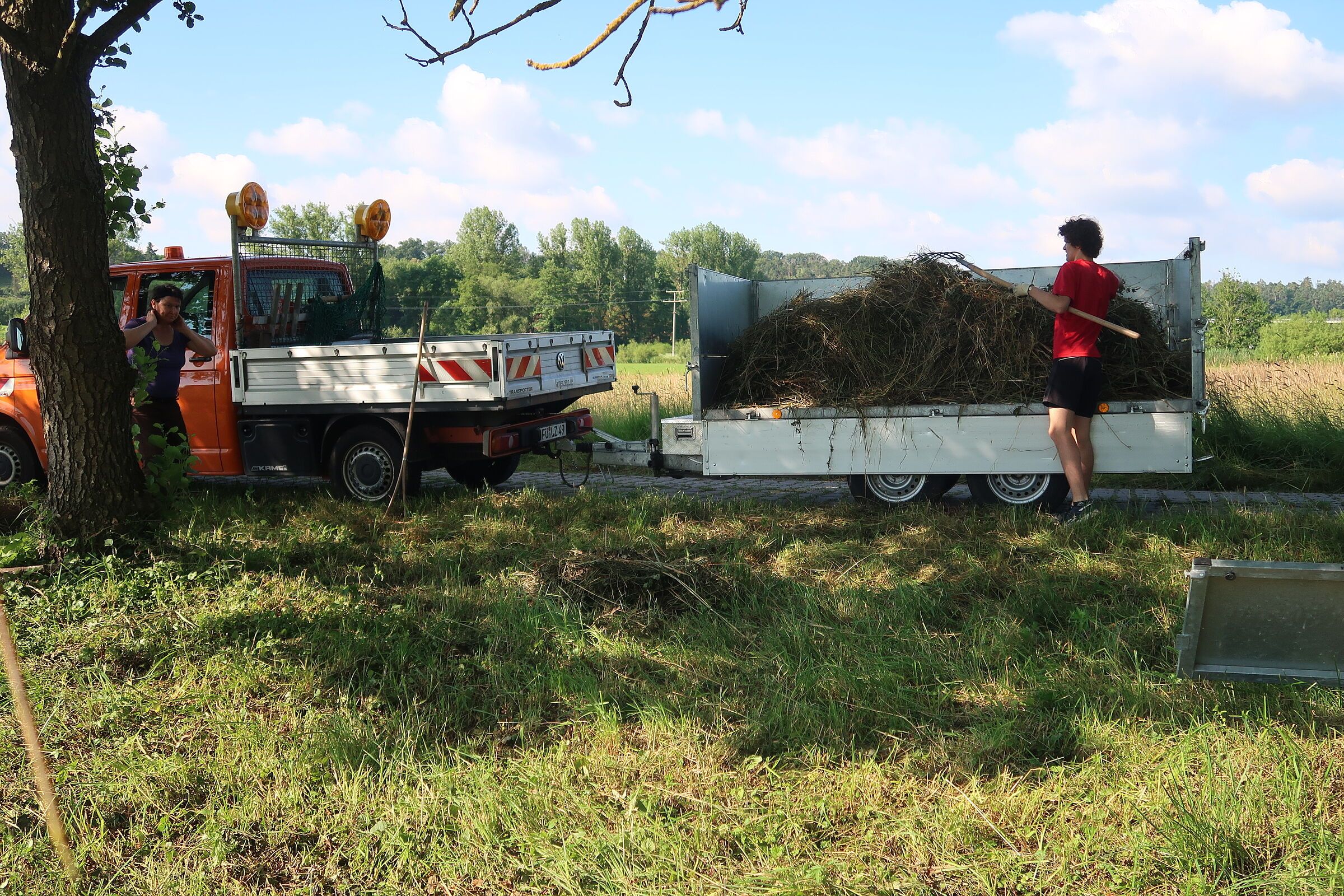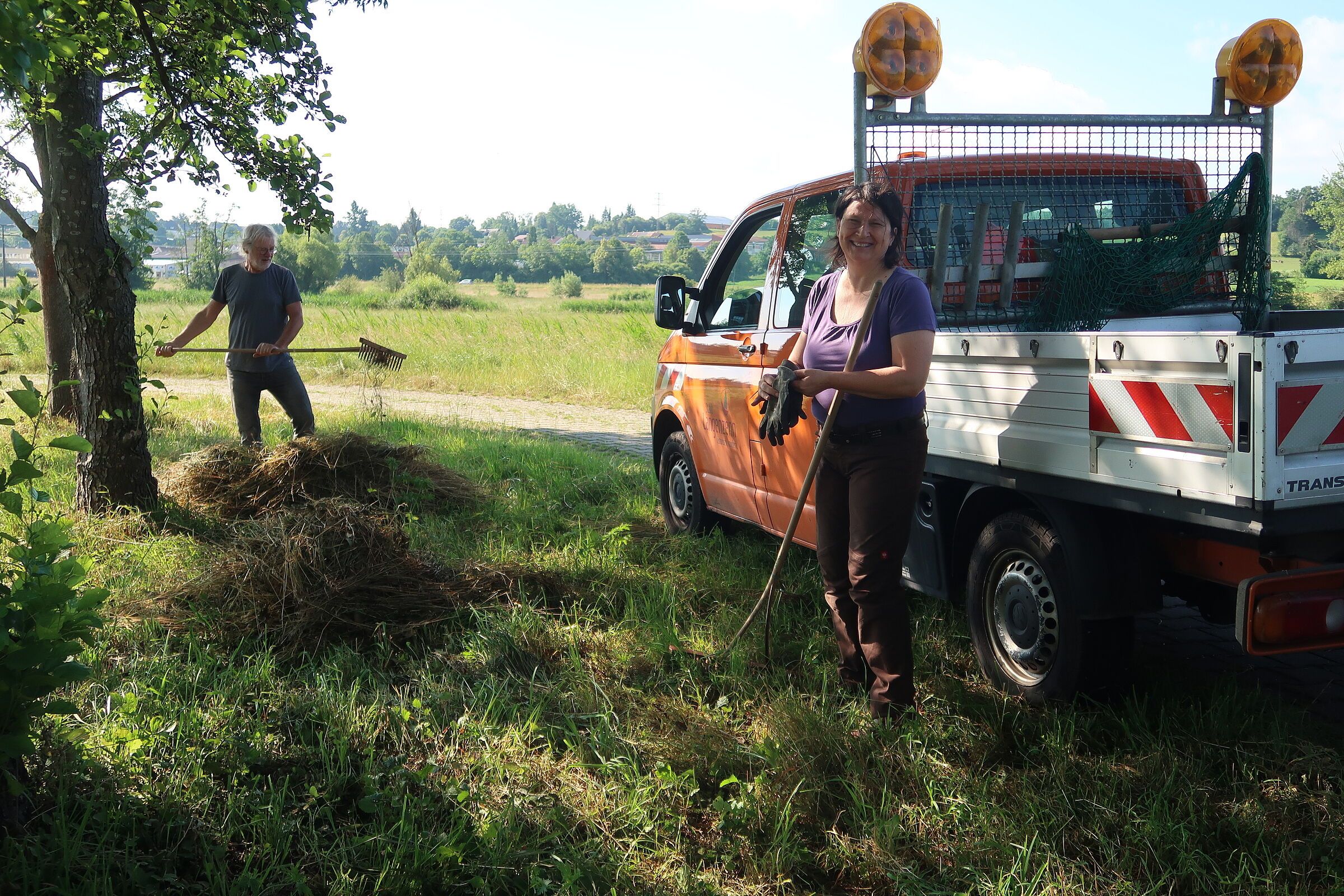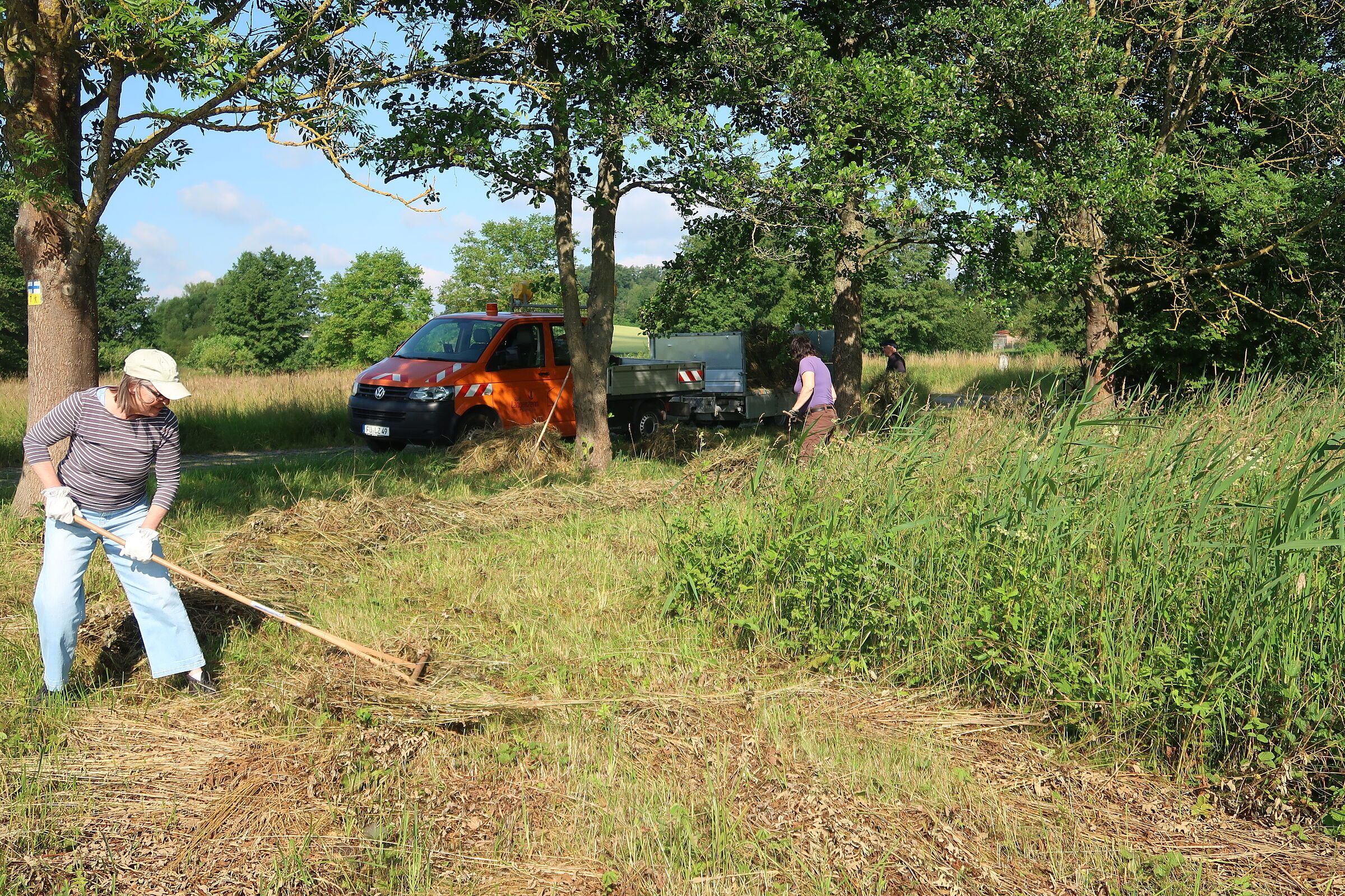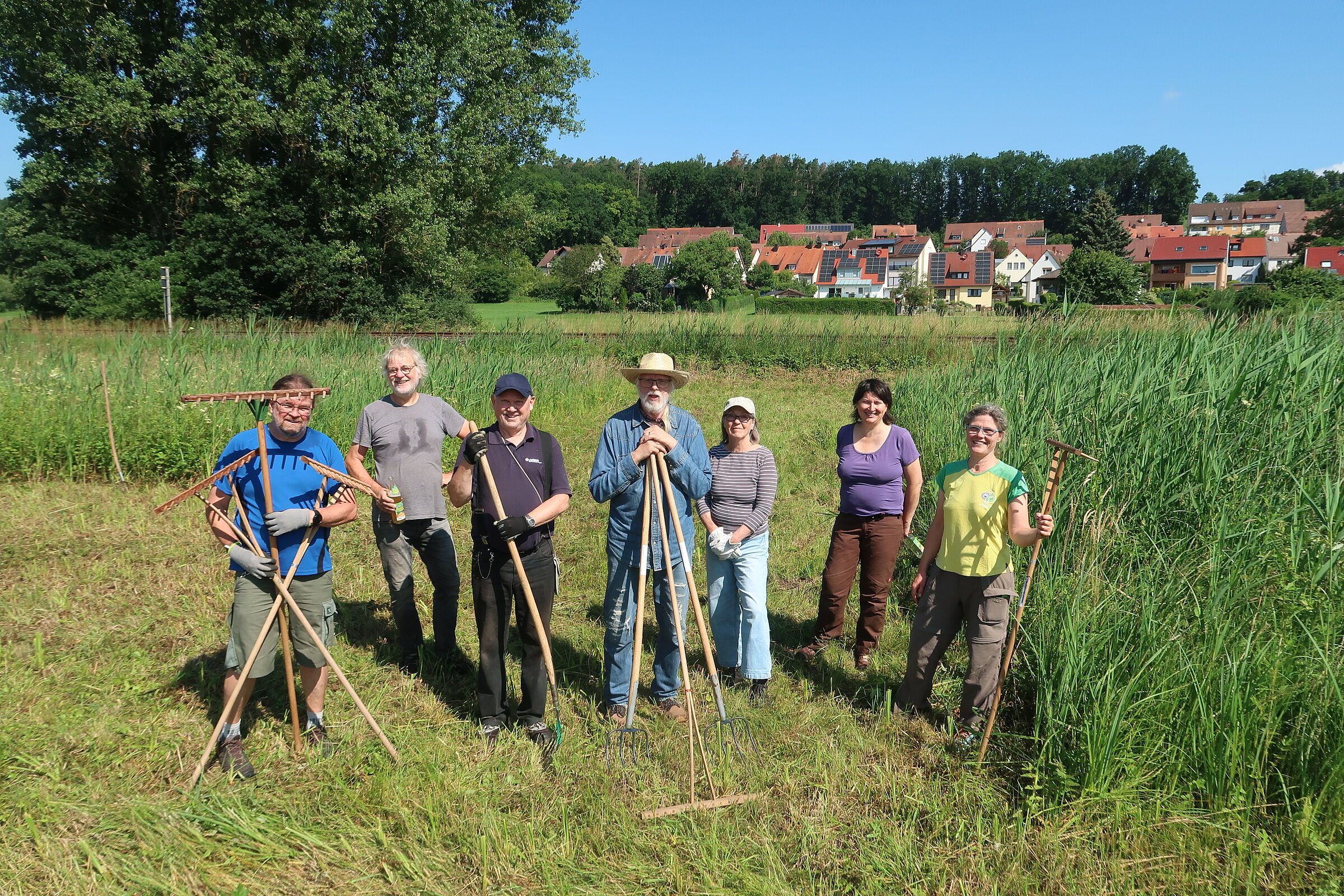Geschafft und stolz blicken Ehrenamtliche auf ihr Werk: sie haben all das gemähte Gras auf der Fläche mit Holzrechen zusammengerecht und das Mähgut mit Heugabeln in den Anhänger geladen. Eine schweißtreibende Angelegenheit! Einige Tage zuvor wurde das Gras mit einem benzinbetriebenen Balkenmäher gemäht.