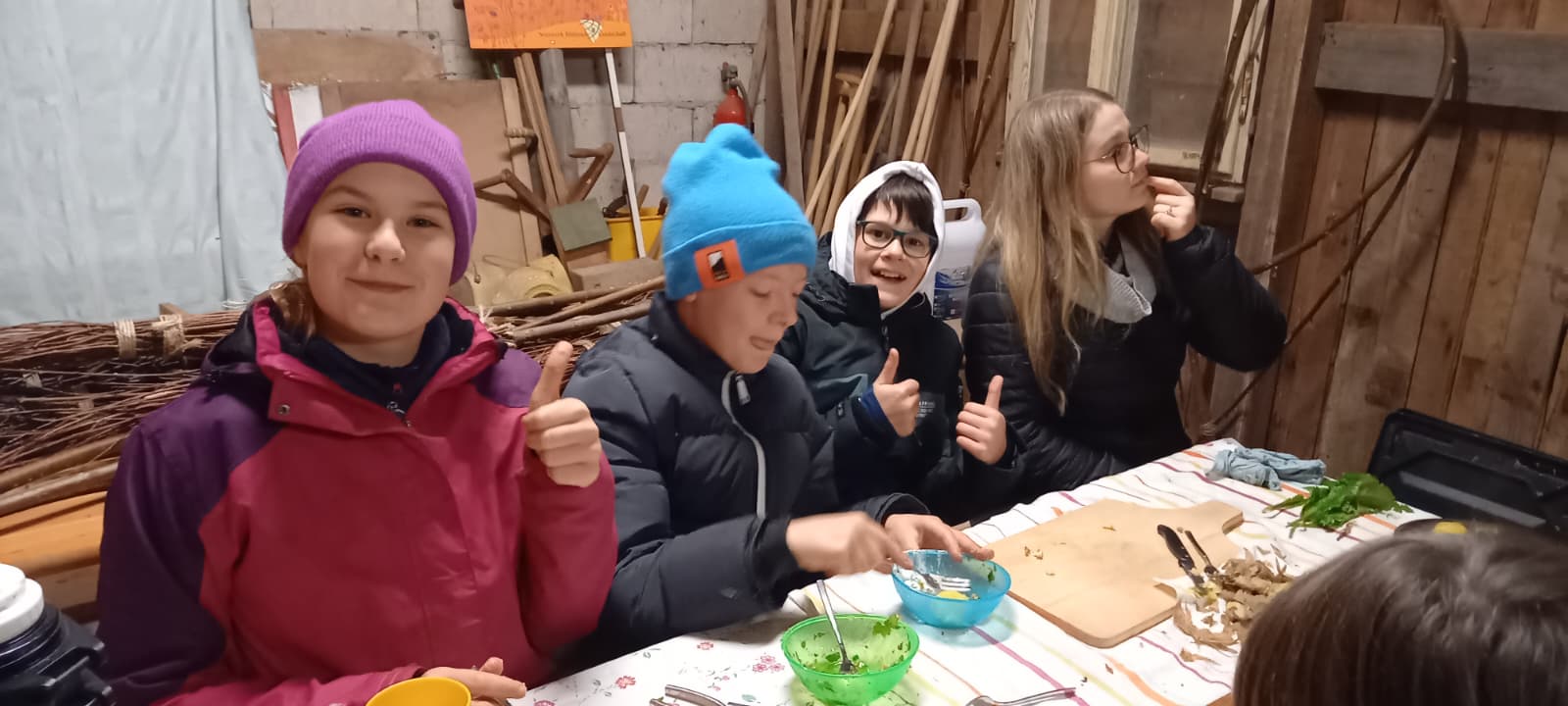 Herbstlich ist es draußen. Werden überhaupt noch Kräuter zu finden sein? Um bei der Kälte warm zu werden, haben wir auf der Schmetterlingswiese Grashaufen zusammen geharkt. Das ist wichtig, um die Wiese abzumagern. Ein Auftrag, den der BUND Naturschutz in Stein auf sich genommen hat. Hierbei haben wir gerne mitgeholfen und eine Menge Spaß dabei. Anschließend ging es ans Kräuter suchen. Viel Zeit blieb uns dafür nicht, weil es bereits früh dunkel wurde. Wir zauberten Kartoffeln mit Kräuterquark! Zusammen haben wir Löwenzahnwurzeln, Vogelmiere und Brennnesseln gefunden. Zwiebeln und Knoblauch waren auch dabei. Während einige von uns noch weiter suchten, bereiteten die anderen die Kartoffeln und das kochende Wasser vor. Die Pausen haben wir genutzt, um alles Gefundene zu waschen und kleinzuschneiden. Zusammen mit Quark entstand ein gut schmeckender Kräuterdip für unsere Kartoffeln.