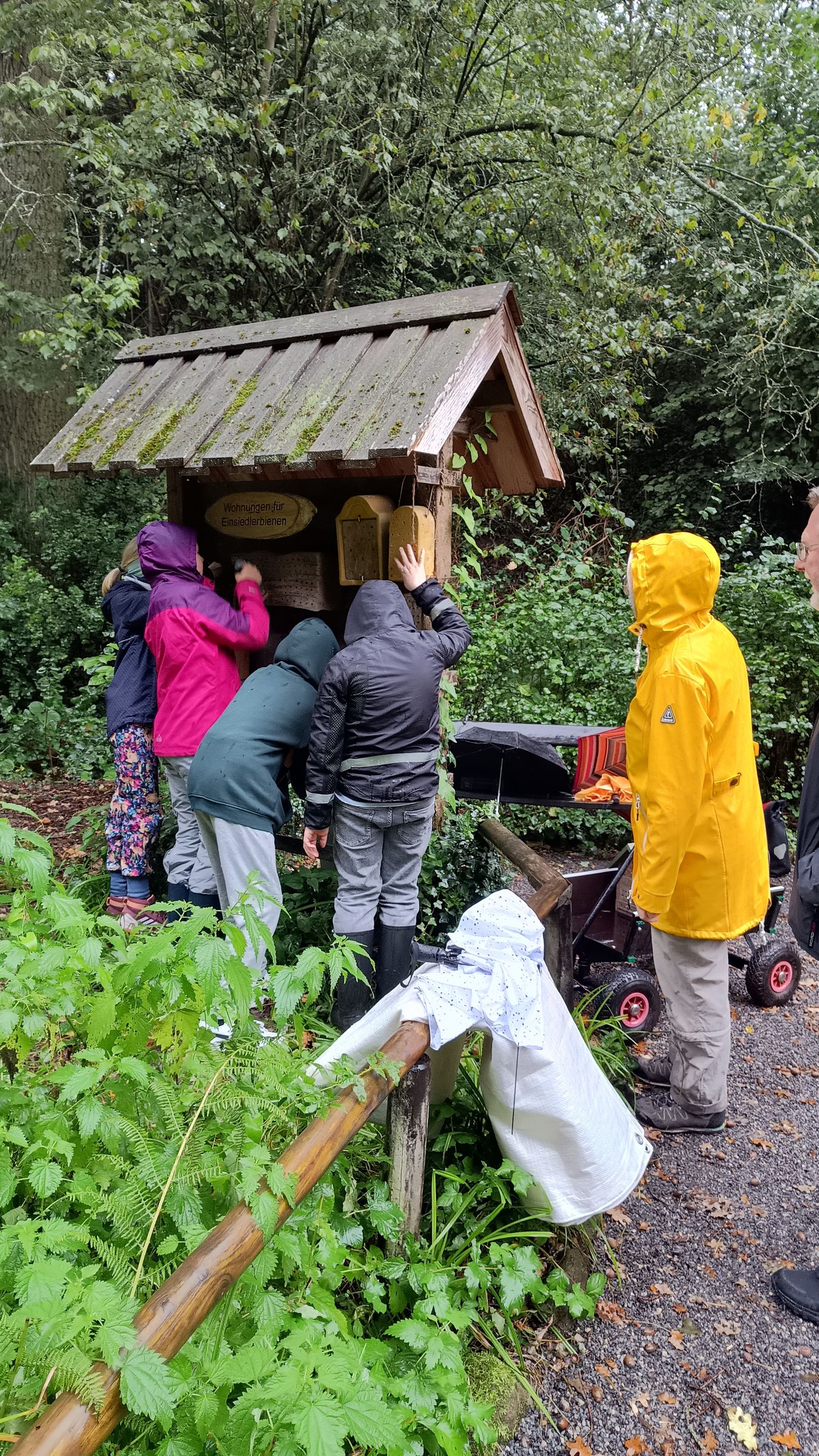 Das Wetter war nicht ideal für unsere kleine Entdeckungstour in den Wald, zum Tümpel und auf die Streuobstwiese. Es regnete zwar nicht mehr, aber alles war noch ziemlich nass. Damit wir trotzdem Insekten entdecken konnten, mussten wir ein paar Tricks anwenden. Zuerst aber starteten wir mit einer Fragerunde: Jeder sollte ein Insekt nennen – zum Beispiel eine Fliege, Libelle, Biene oder Ameise. Alle hatten eine Idee. Und wenn eine Antwort nicht ganz stimmte, haben wir gemeinsam besprochen, warum das so ist.