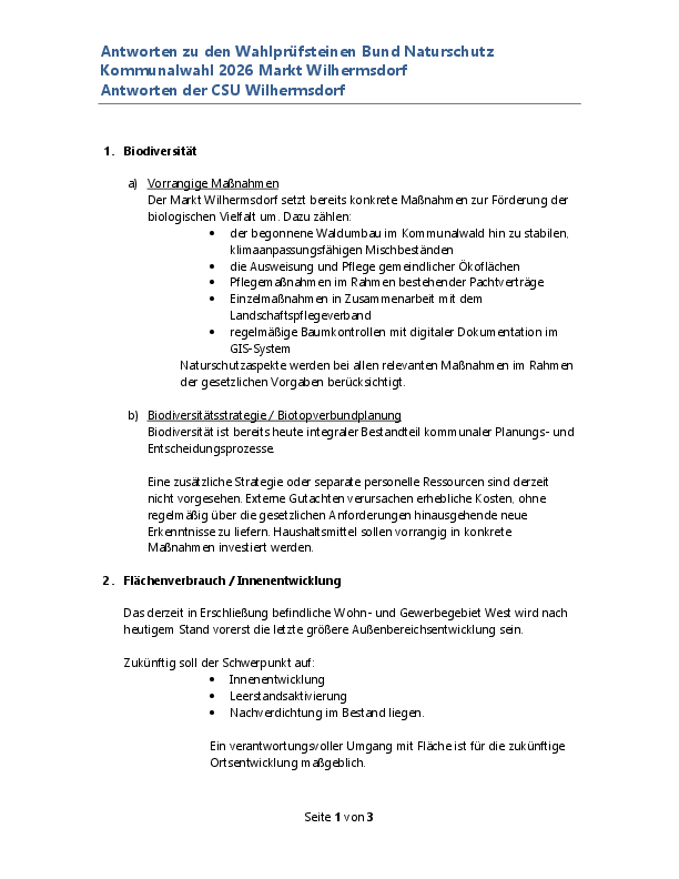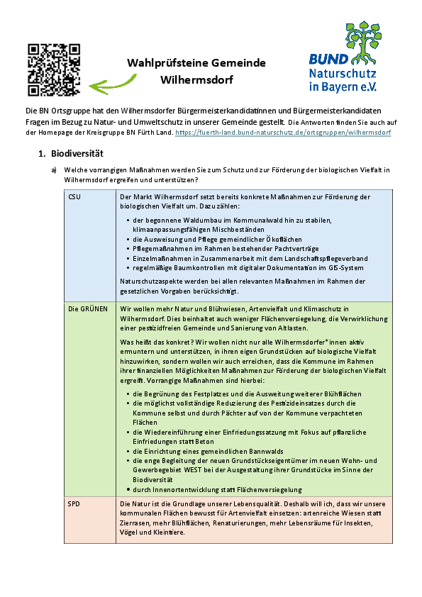 Der BUND Naturschutz in Wilhermsdorf hat Ende Januar 2026 an die Fraktionsvorsitzenden der demokratischen Parteien in Wilhermsdorf einen Fragebogen mit “Wahlprüfsteinen” verschickt und um Antwort bis 15.2.2026 gebeten.