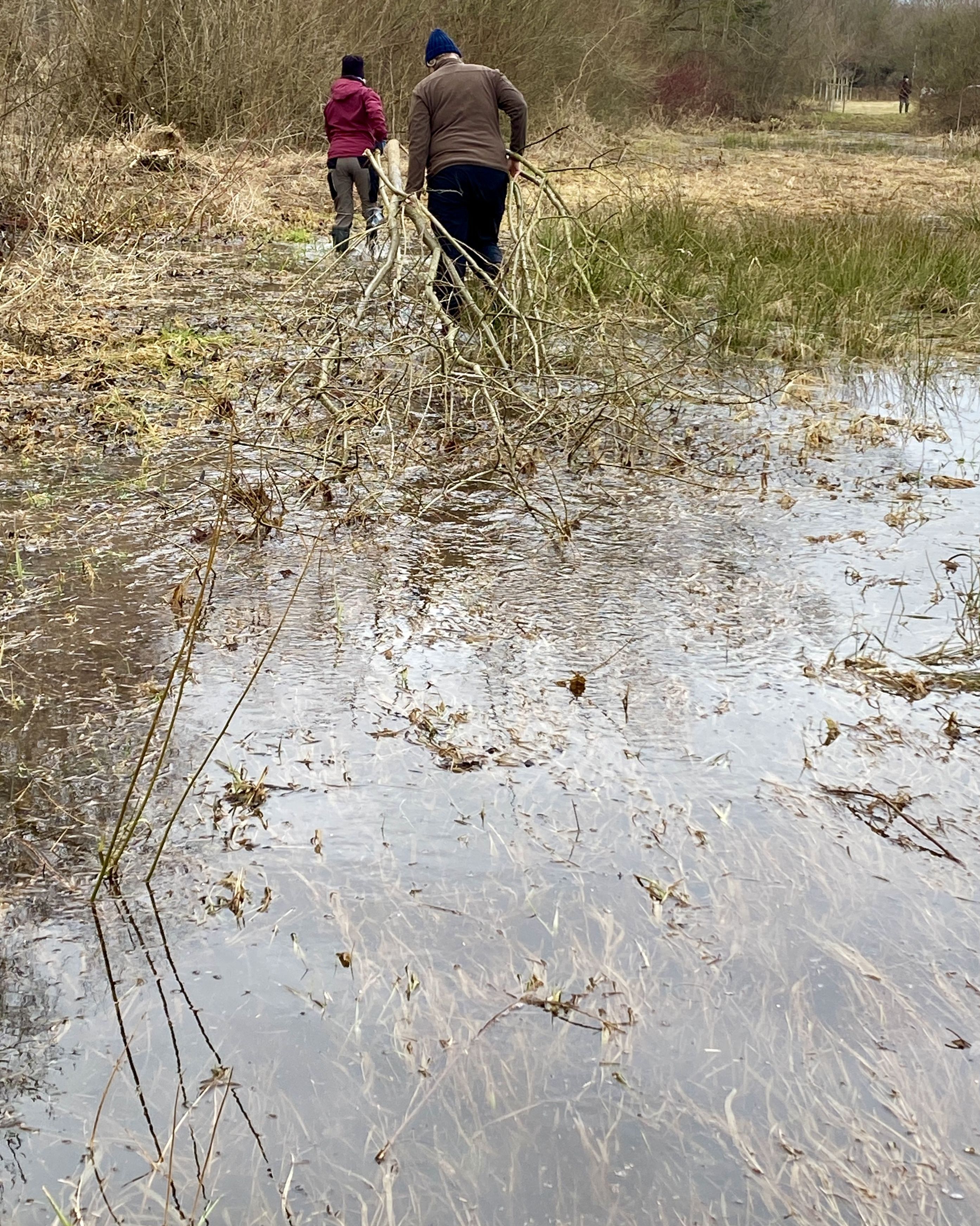 Die örtlichen Verhältnisse waren dieses Jahr wirklich schwierig: bis zu 20 cm Wasser standen auf der Wiese und in den Feldgehölzen, die vor allem aus vielen verschiedenen, üppig wachsenden Weidenarten bestehen. Nach dem Schneiden mit der Motorsäge wurden die bis zu vier Meter langen Äste durch das Wasser watend nach außen an den Biberttalweg geschleift, wo sie später von der Stadt Zirndorf abgeholt und gehäckselt werden. Nach zweieinhalb Stunden harter Arbeit und einem Sturz ins kalte Schmelzwasser war dieser Arbeitseinsatz der Ortsgruppe Zirndorf geschafft.