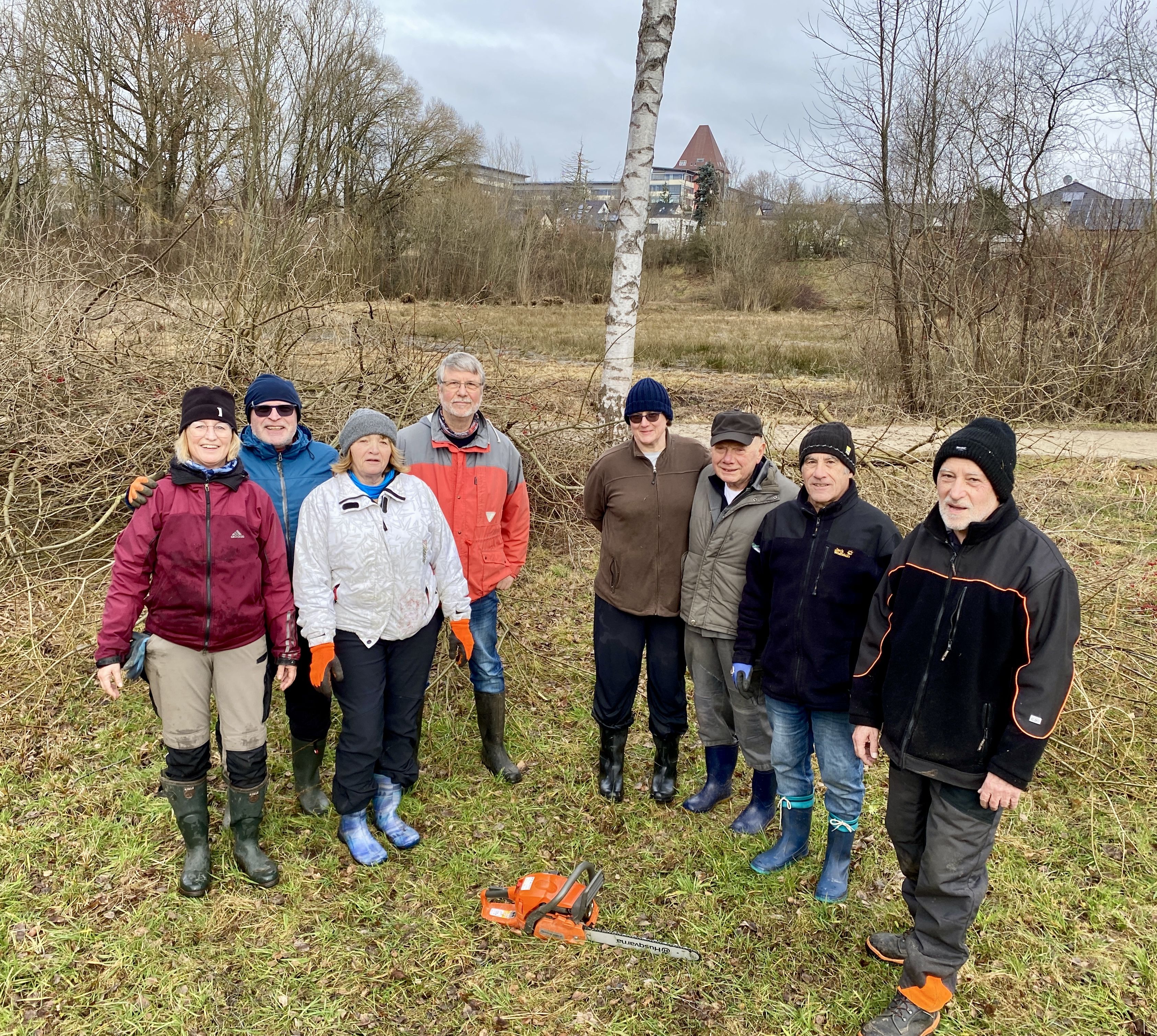 Am 14.02.26 fanden sich mit neun Mitgliedern der Ortsgruppe Zirndorf erfreulich viele Helfer ein, um den jährlich anstehenden Stockhieb der Feldgehölze auf unserem Feuchtbiotop Hammerstättchen durchzuführen. Seit nunmehr 41 Jahren pflegt die Ortsgruppe Zirndorf das am Rand der Bibertaue gelegene Feuchtbiotop, es wird immer ein anderen Teil der Feldgehölze auf den Stock gesetzt. Auf diese Weise wird das Zuwachsen der Feuchtwiese und die Beschattung einer sandigen Böschung mit Grasnelken verhindert.