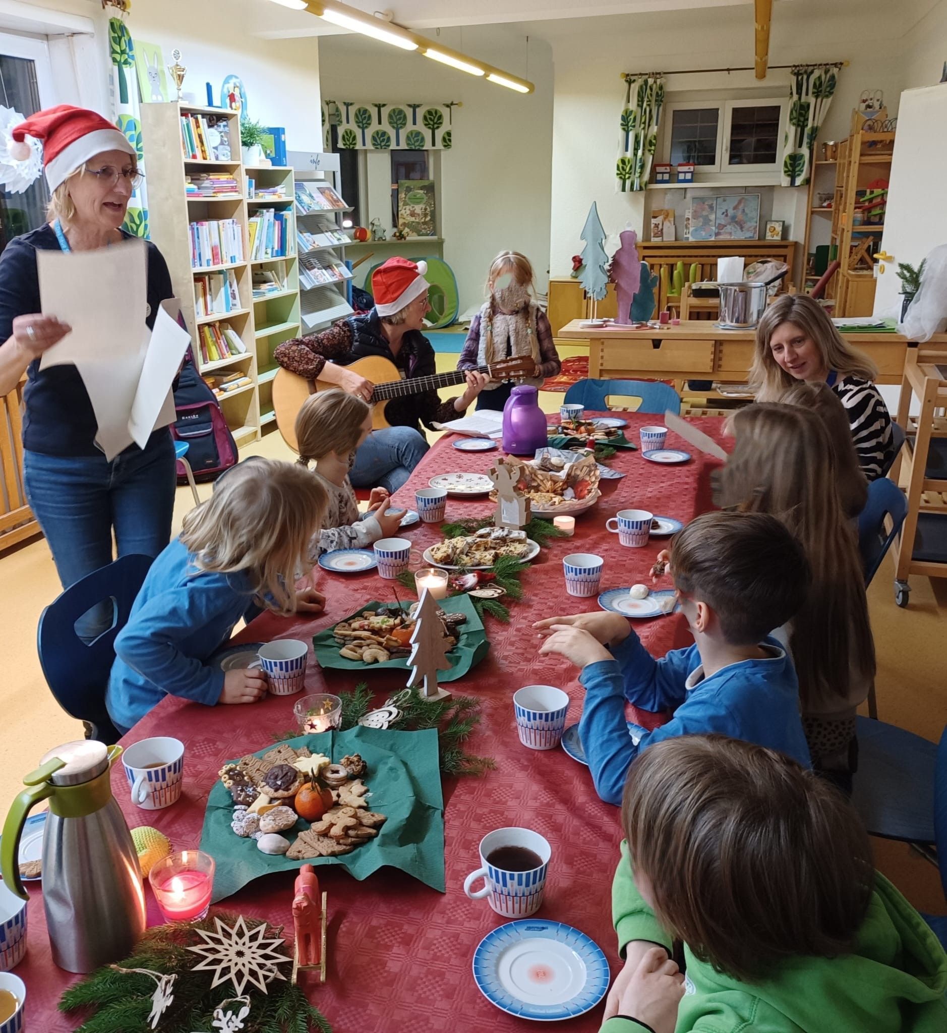Nachdem die Plätzchen fertig waren, konnten wir sie beim Punschtrinken und Liedersingen verspeisen. Zwischendurch hörten wir eine Geschichte von einem Weihnachtsmann, der eine Eisbärenmutter mit ihren Jungen rettete. Warum das nötig war? Klar, der Lebensraum der Eisbären war durch die Klimaveränderung bedroht.