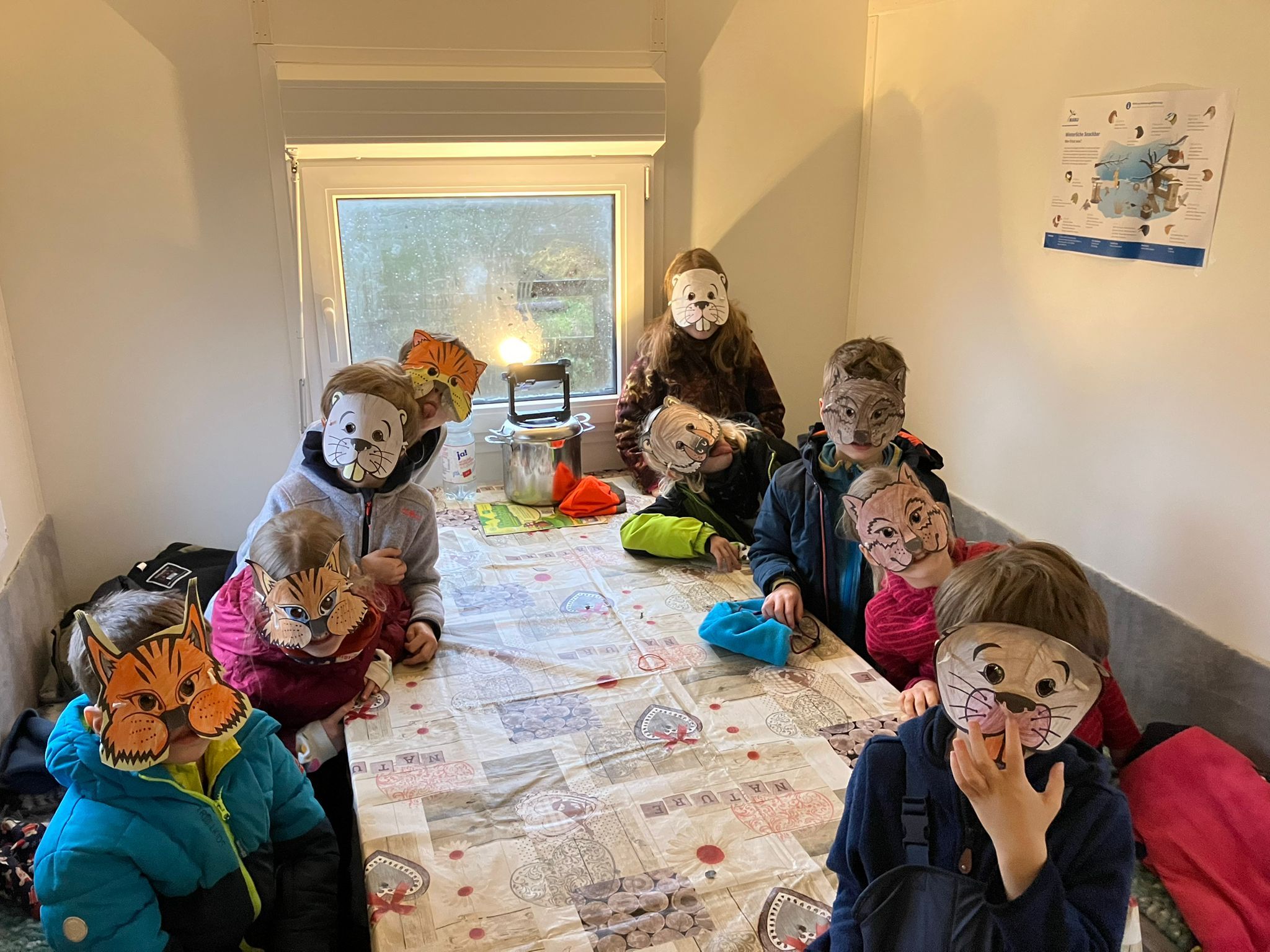 Februar 2026: Treffen der wilden Tiere…am Lagerfeuer. Das geplante Lagerfeuer fiel leider wegen Regen ins Wasser. Dafür bemalten wir in unserem Bauwagen Tiermasken, machten ein Tierquizz und es gab Apfel/Birnenpunsch und Haferkekse.