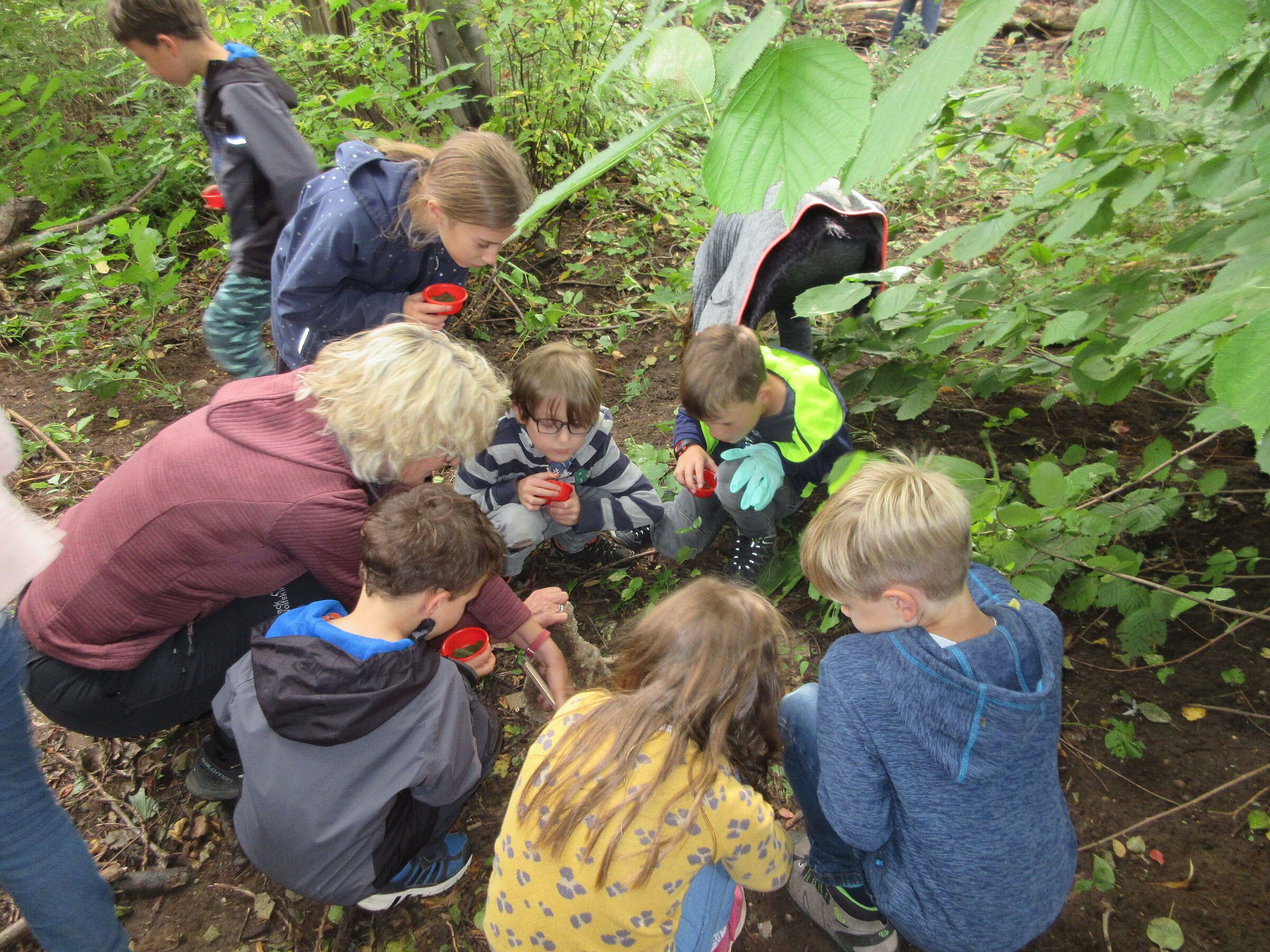 Anschließend schwärmten wir im Garten aus und suchten nach den kleinen Krabbeltierchen. Es war gar nicht so leicht, die Spinnen zu entdecken und sie mit unseren Becherlupen einzufangen. In den Becherlupen konnten wir sie genauestens betrachten, das war wirklich sehr interessant und gar nicht mehr gruselig. Danach brachten wir sie zu ihrem Fundort zurück.